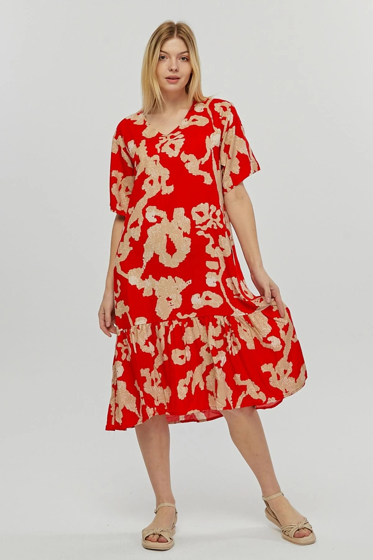 Kadın Büyük Beden V Yaka Eteği Pileli Baskılı Dokuma Elbise